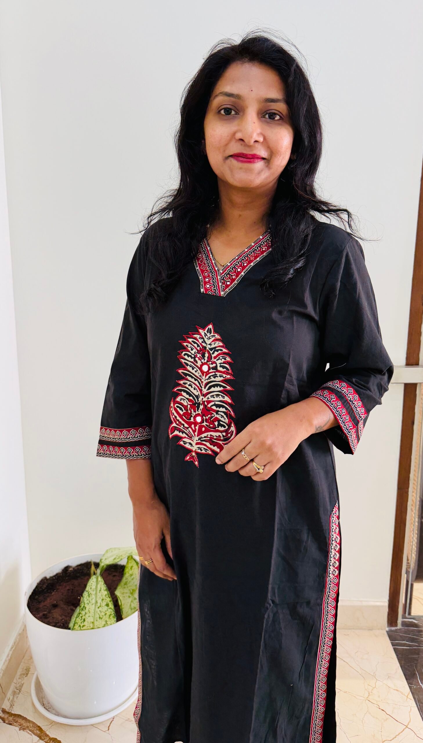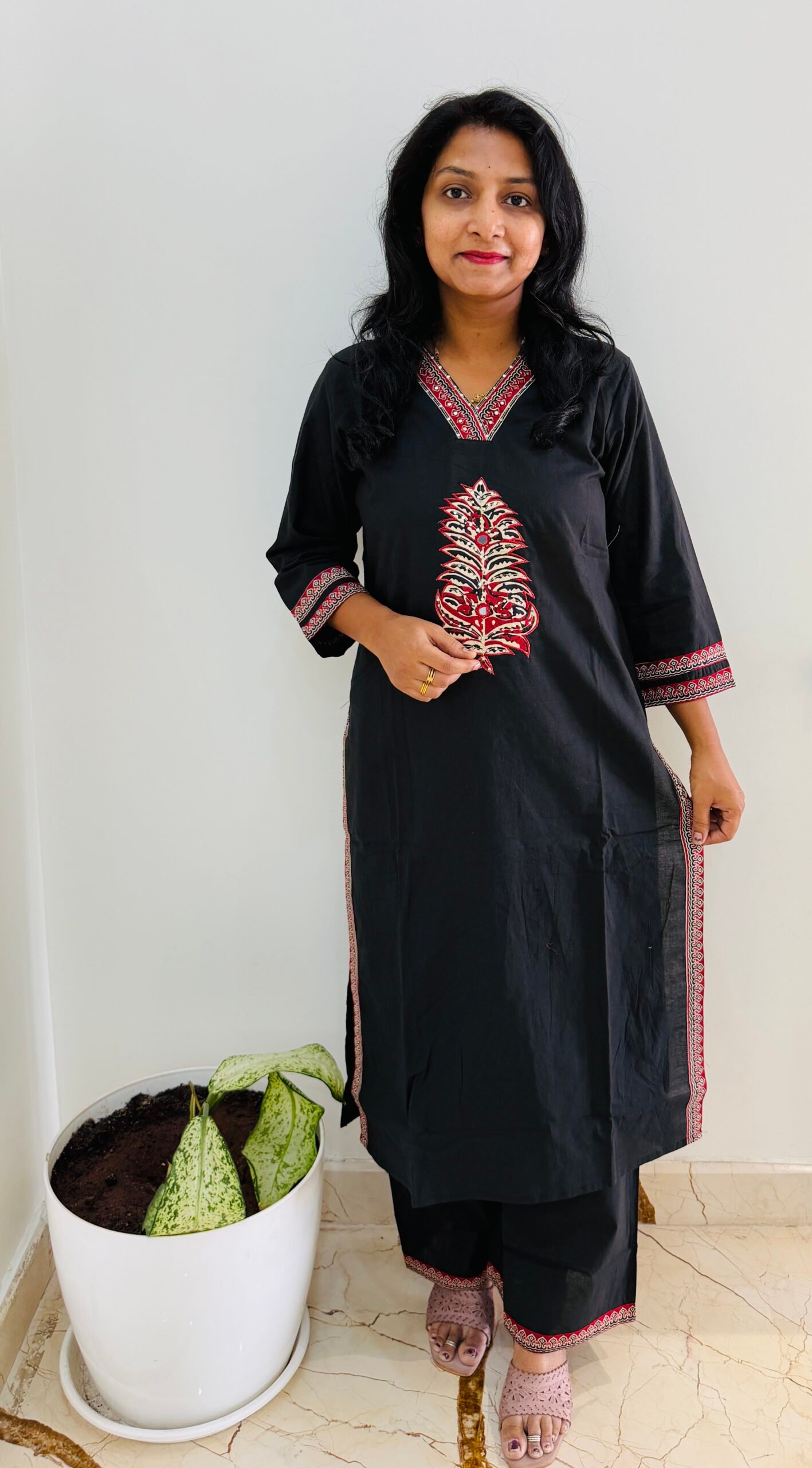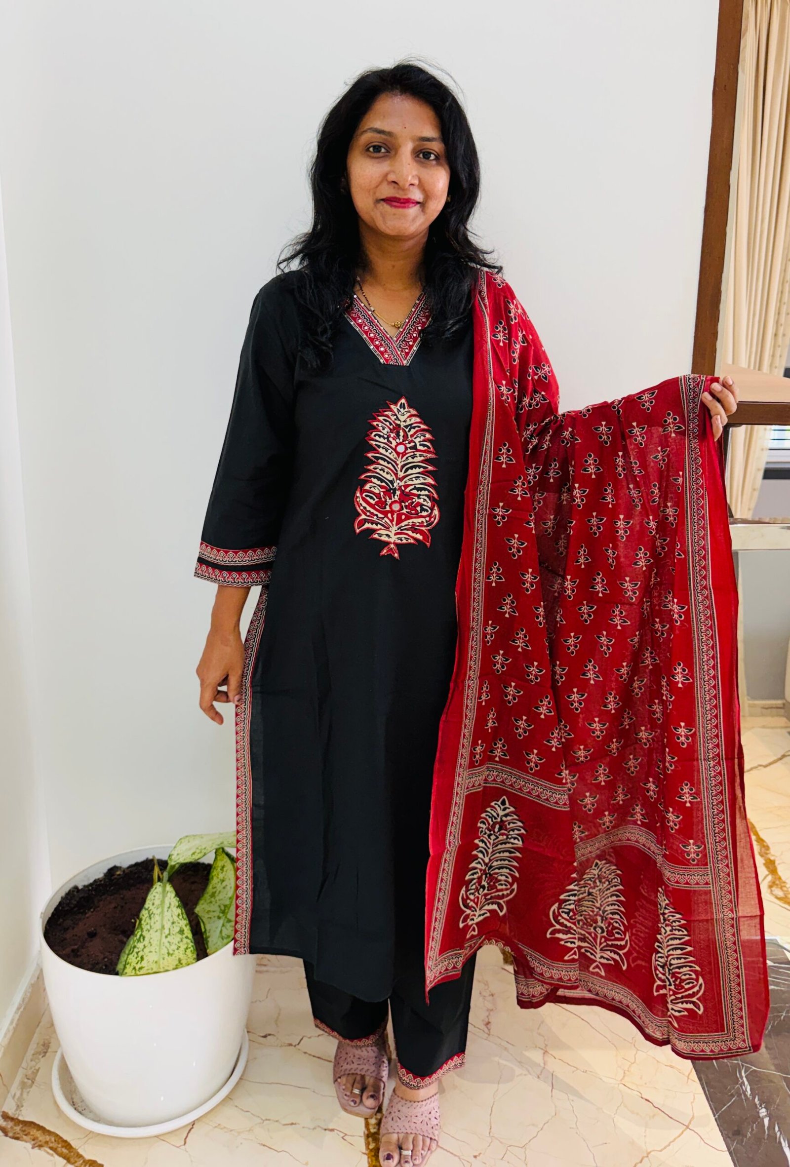 PATTERN – V Neck Applique work with real mirror work with Ajrakh print pure cotton 3PC Kurti set