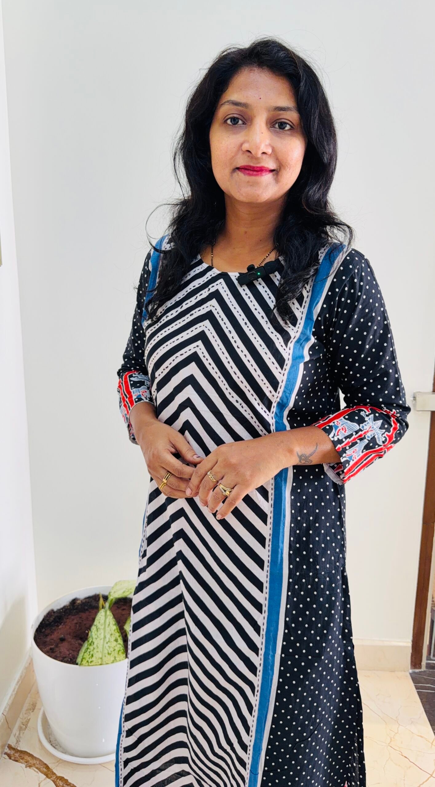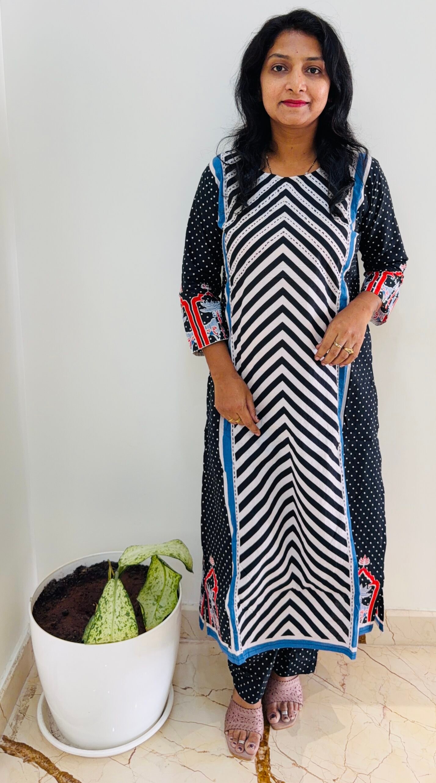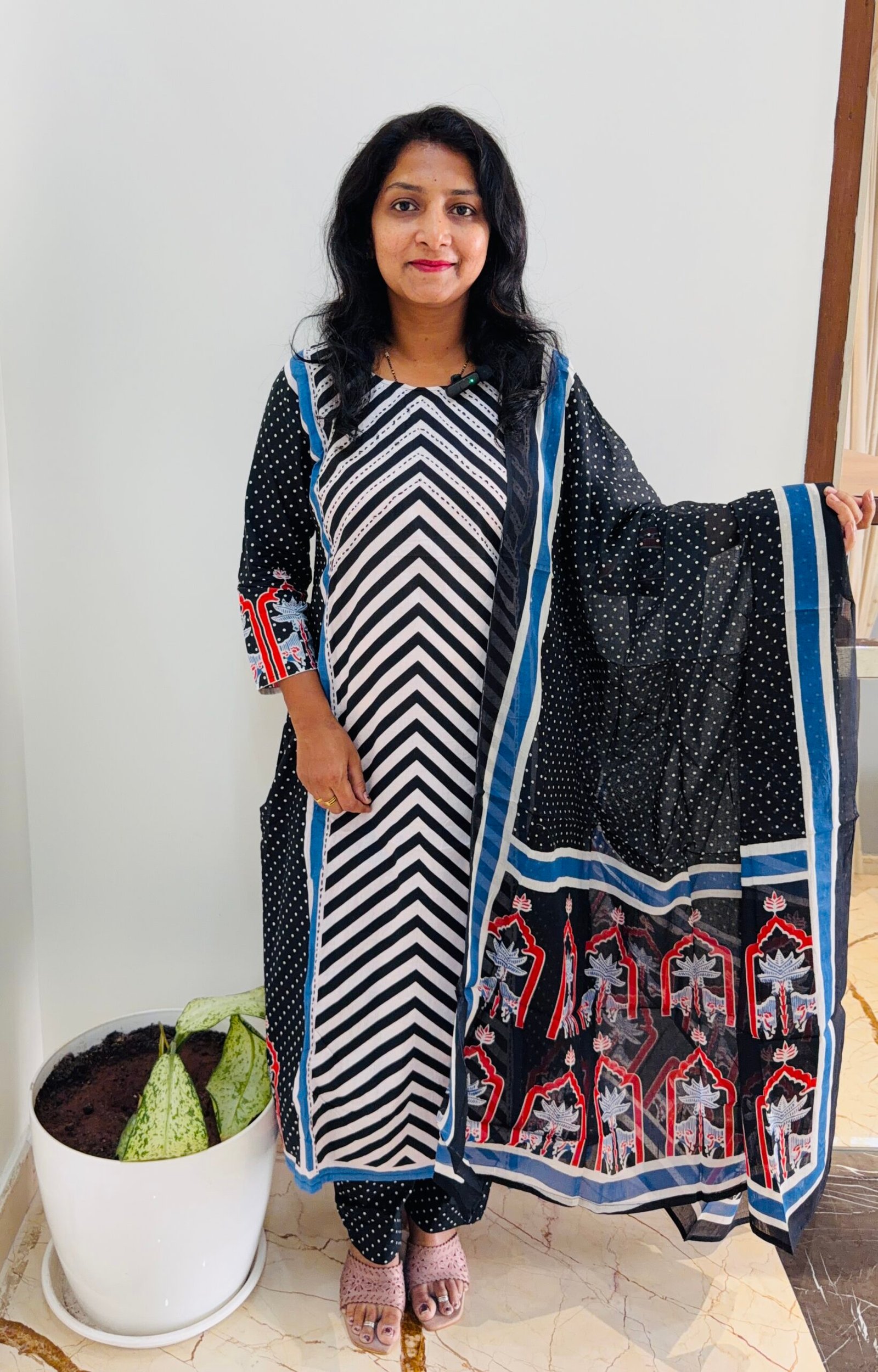 PATTERN – Round Neck Cross Stripe With Kantha detailing on Yolk part and polkadot print pure cotton 3PC Kurti set