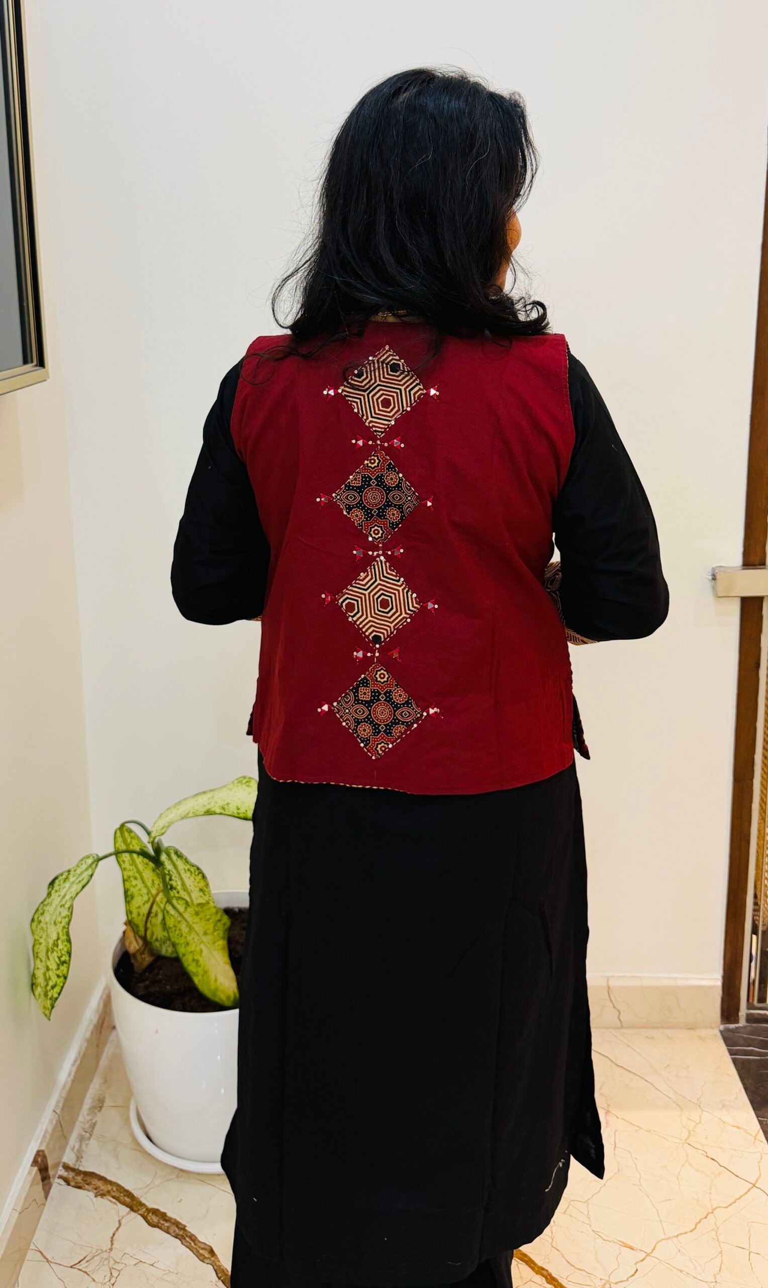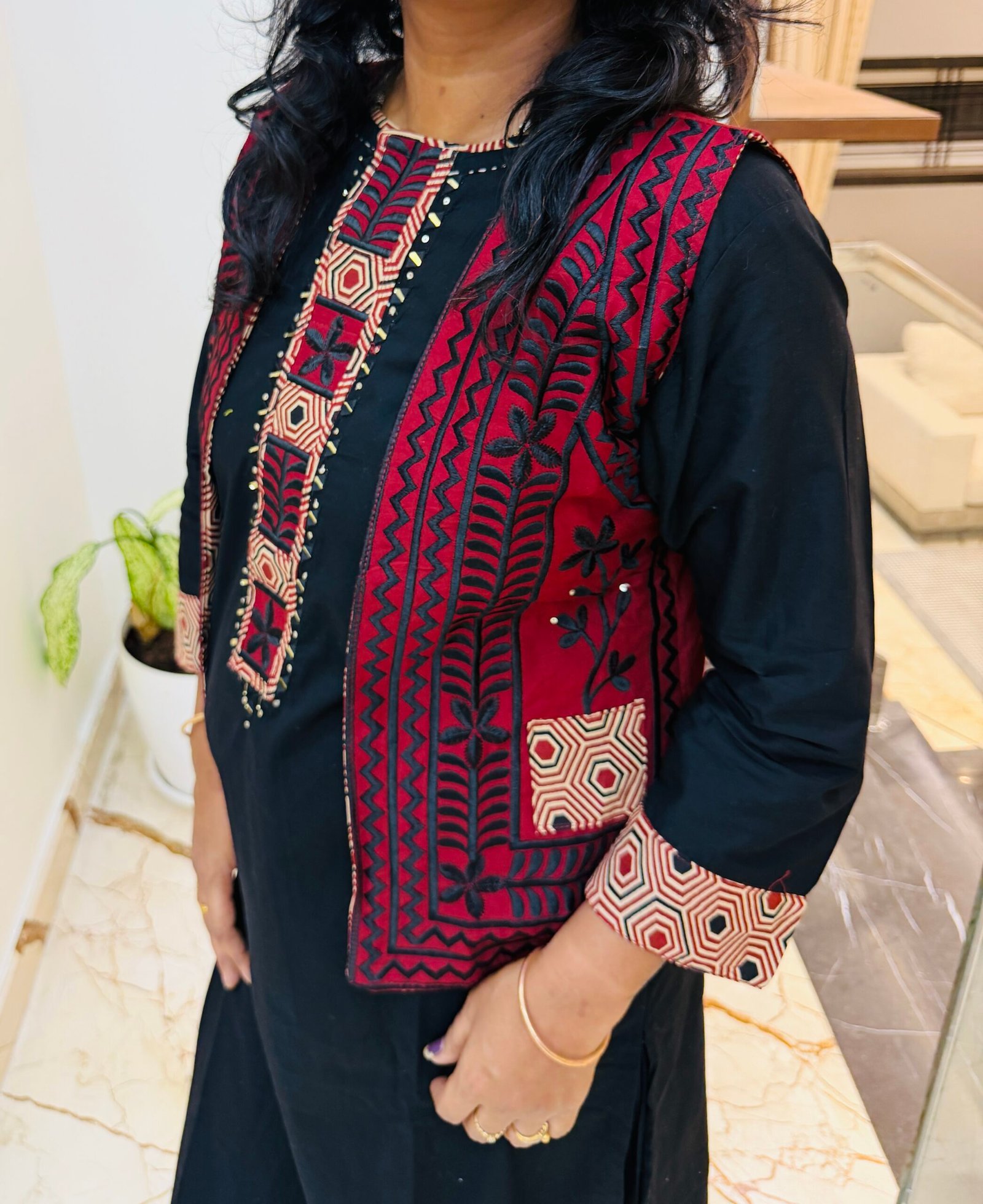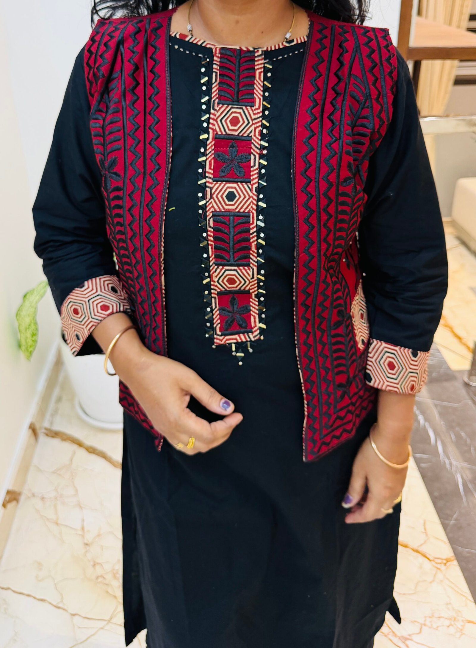 Bored of wearing the same printed cords everyday than try this Ajrakh CORDSET Heavy Embroidered jacket at front and back both with mirror work detailing on jacket and kurti paired with a solid black cotton pant