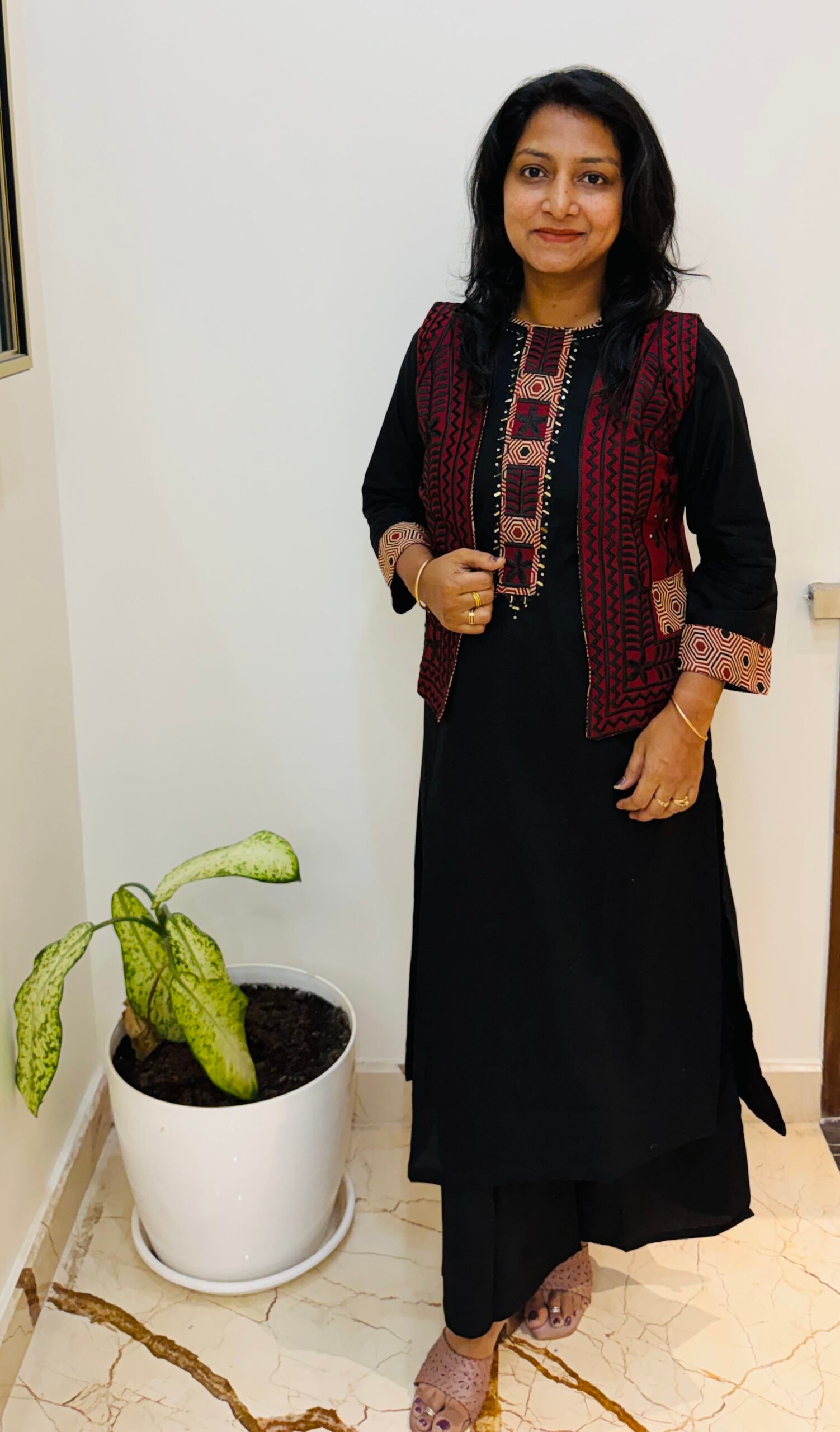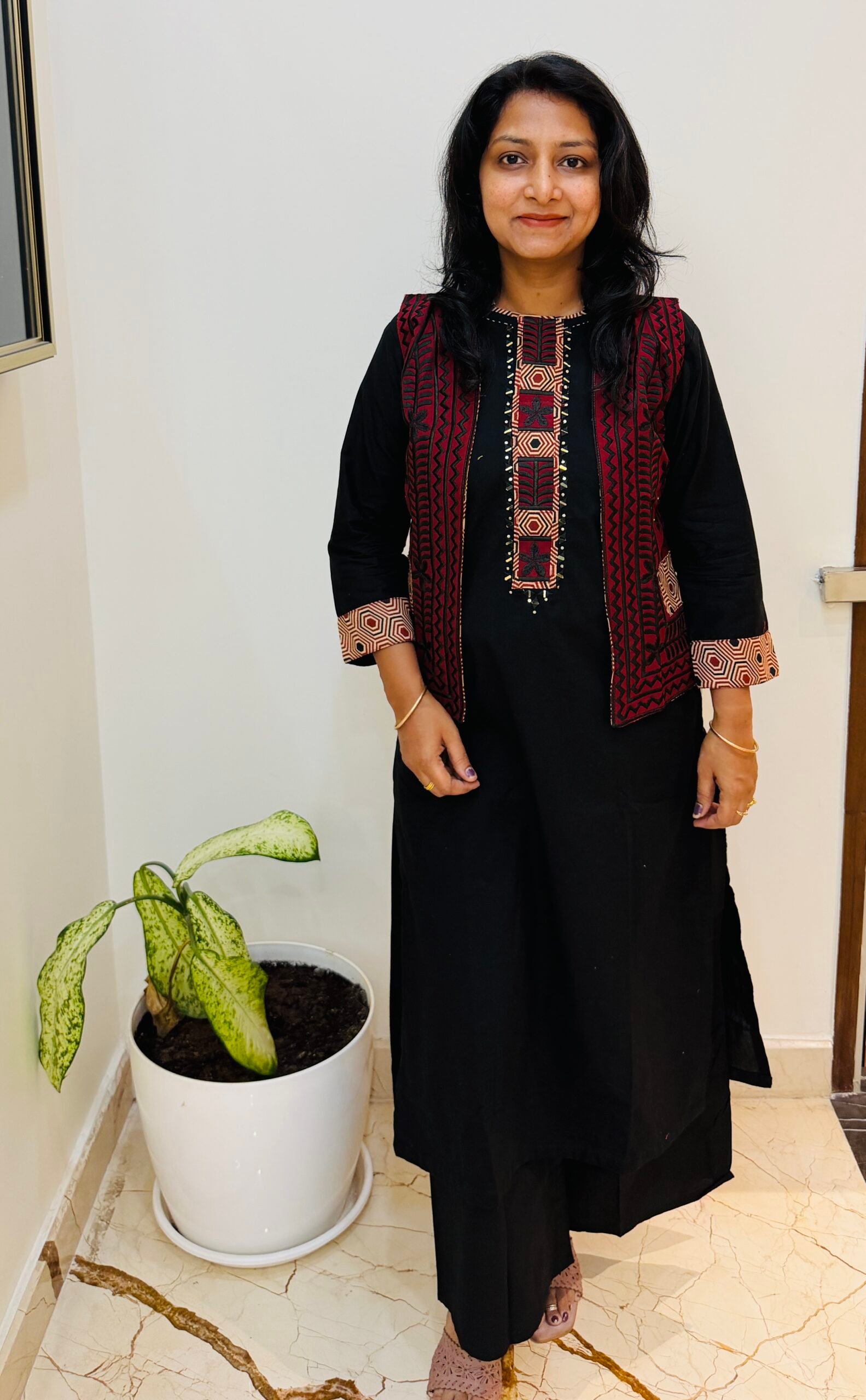 PATTERN – Cordset with heavy embroidered jacket ajrakh detailing paired with Black Plazo pant and Mirror work  detailing on kurti