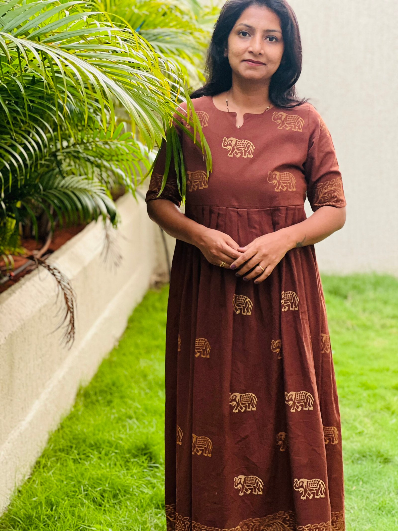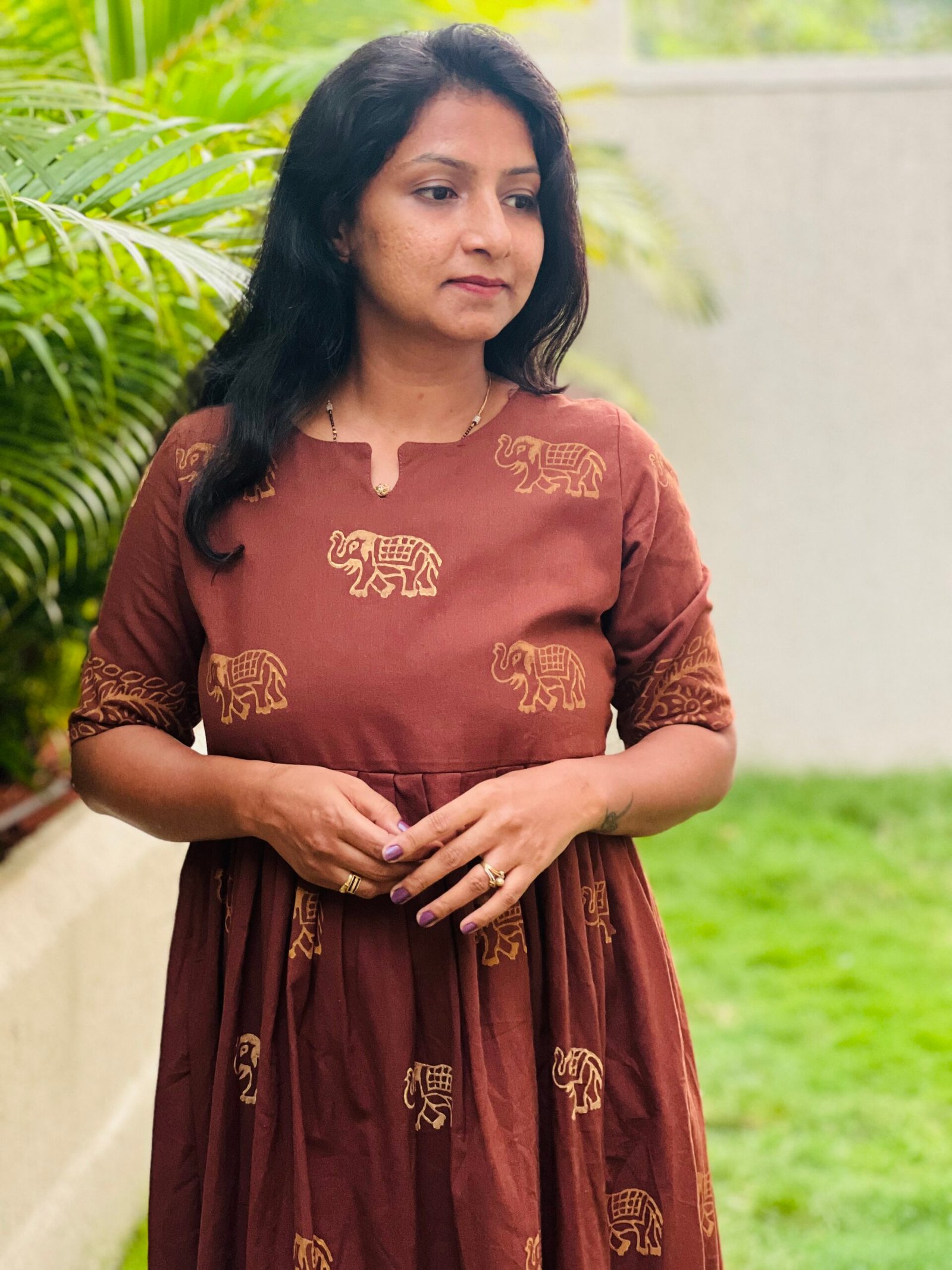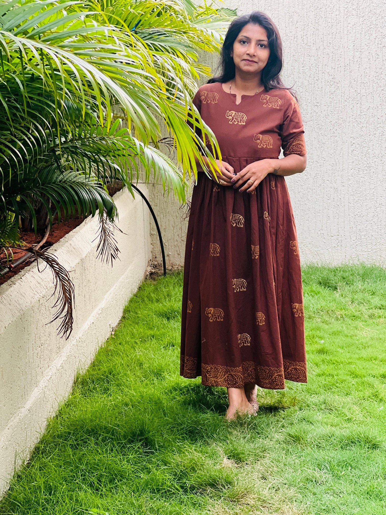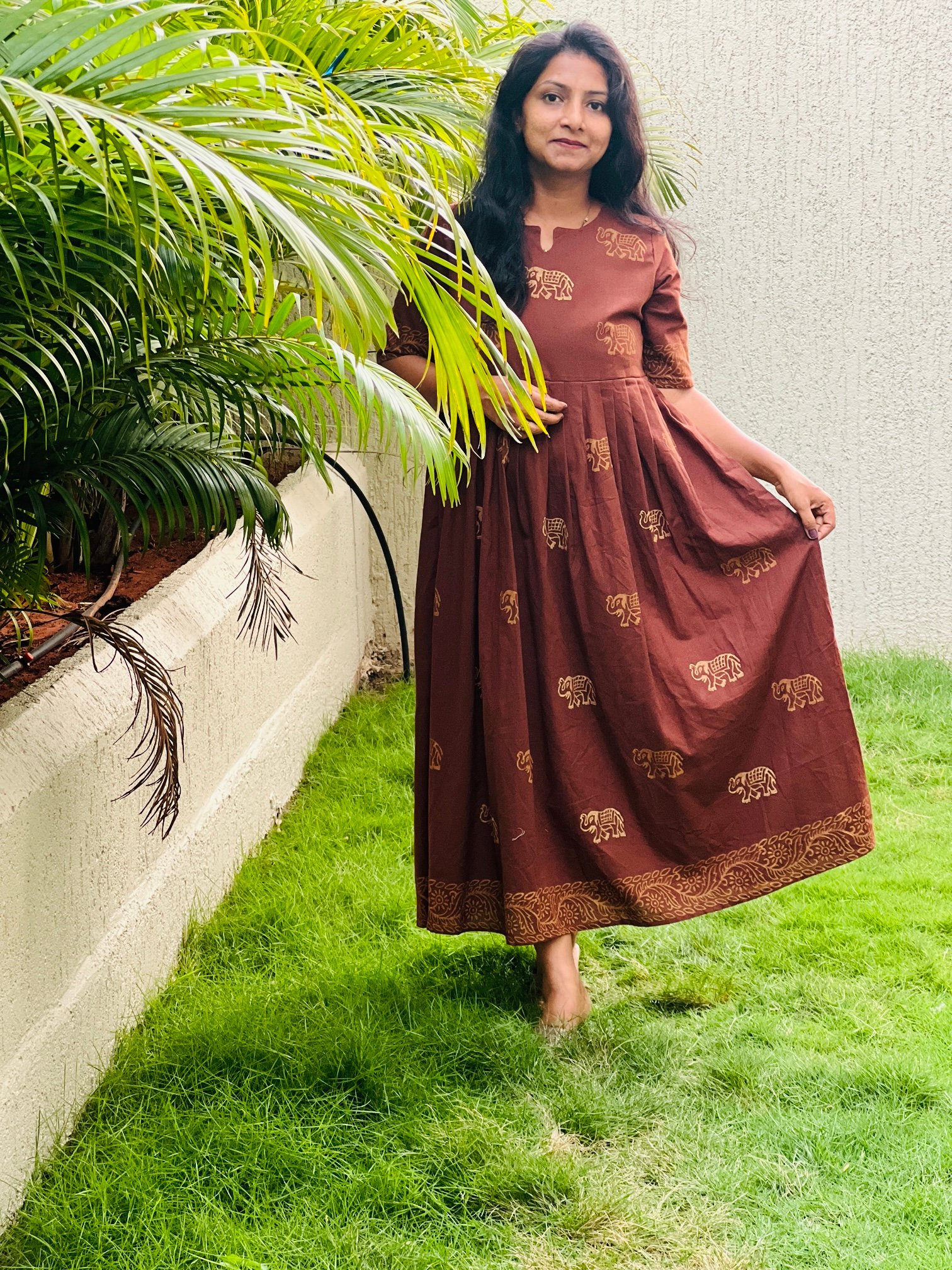 Looking for a Dress for any outings or Office Wear with a Desi touch than this Handblock Print Dress with elephant and border Handblock print detailing would be a great choice for a Chic Aesthetic look.