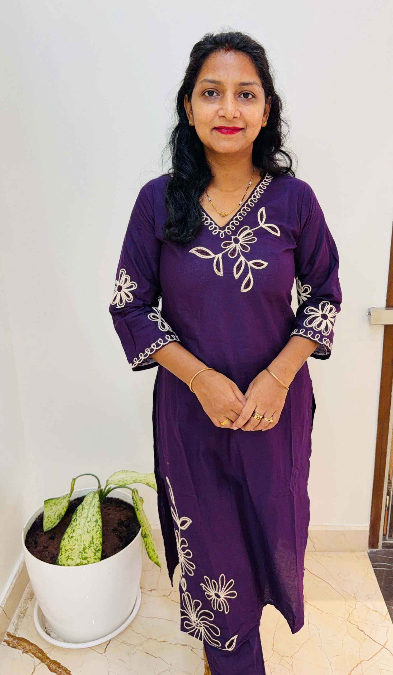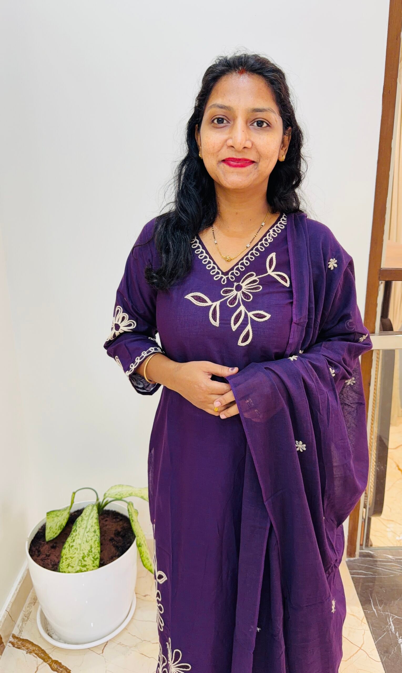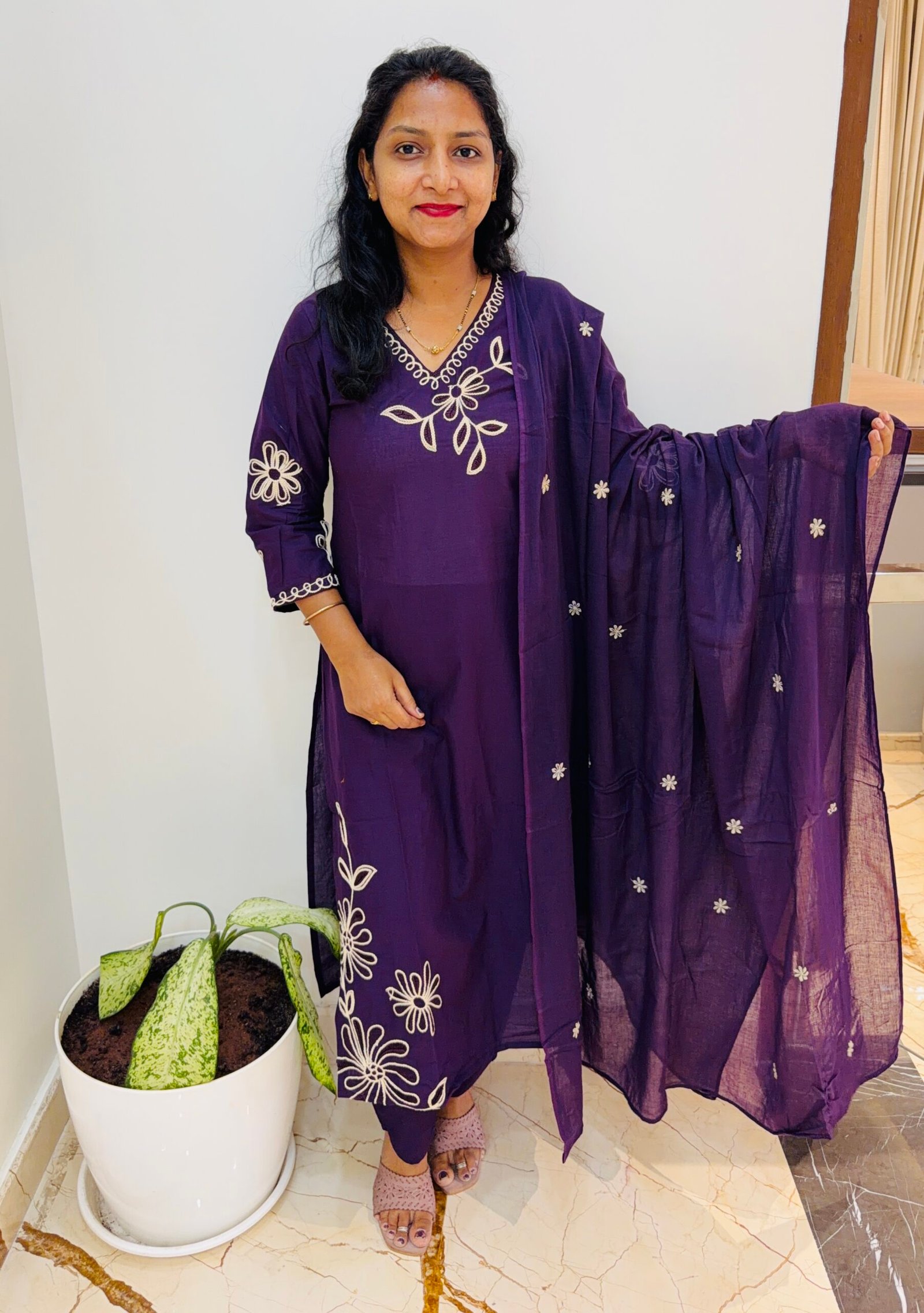 Dark Purple Thread Embroidered pure cotton 3PC Kurti set