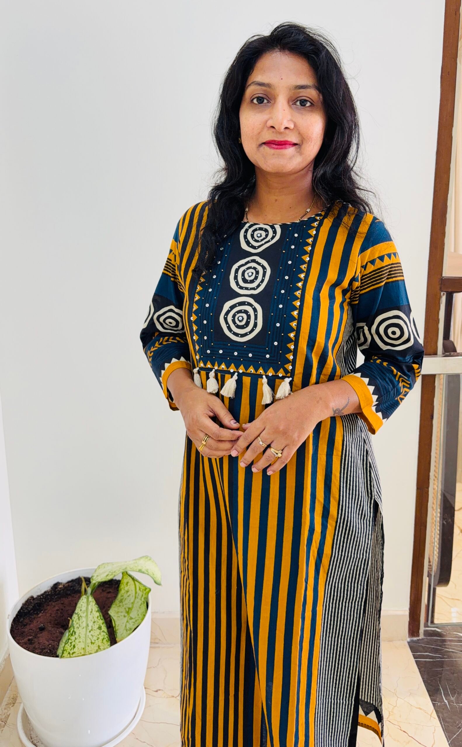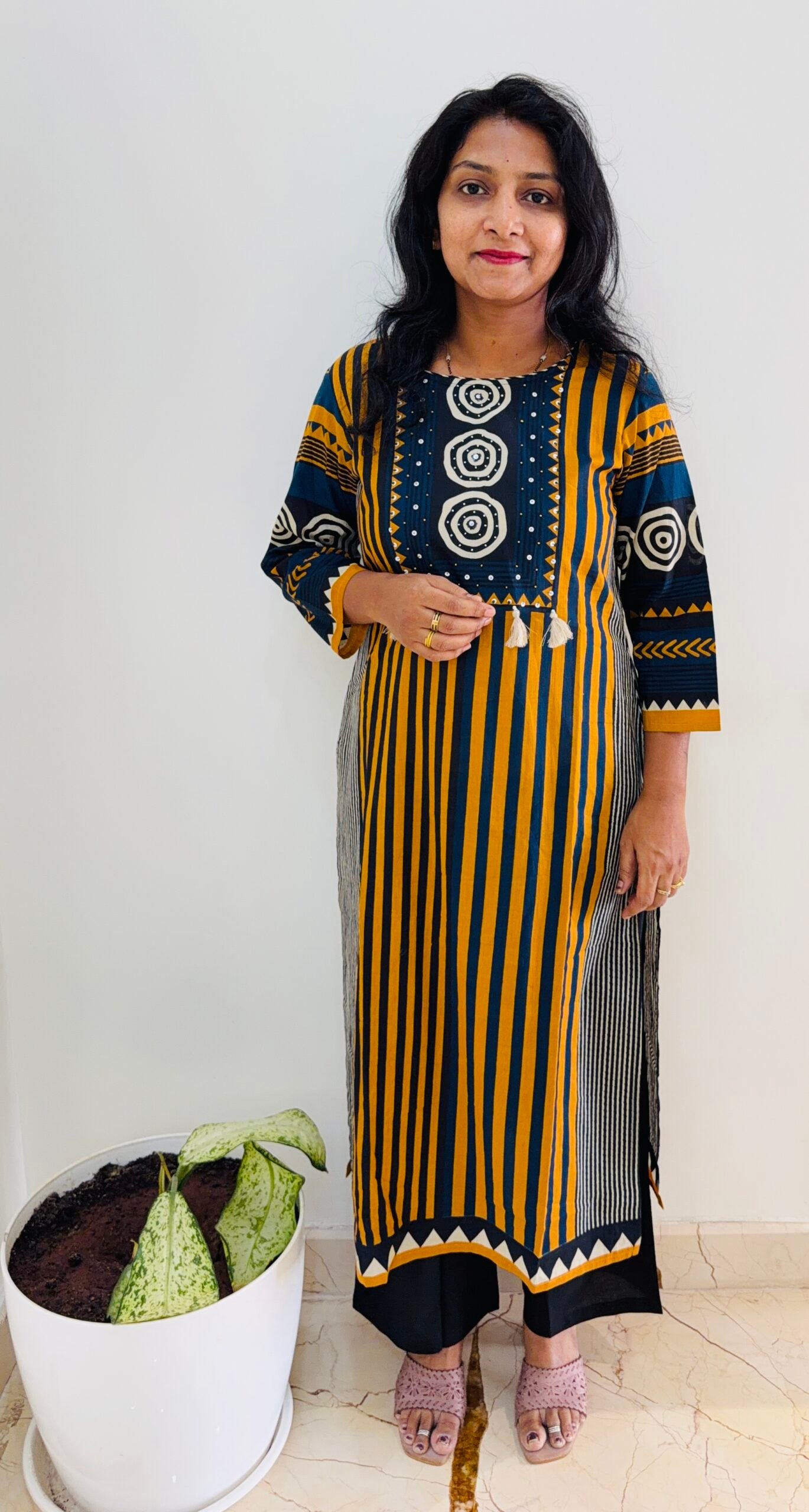 PATTERN – Around Neck with beautiful tassels and pearl work detailing Stripe 3PC Kurti set