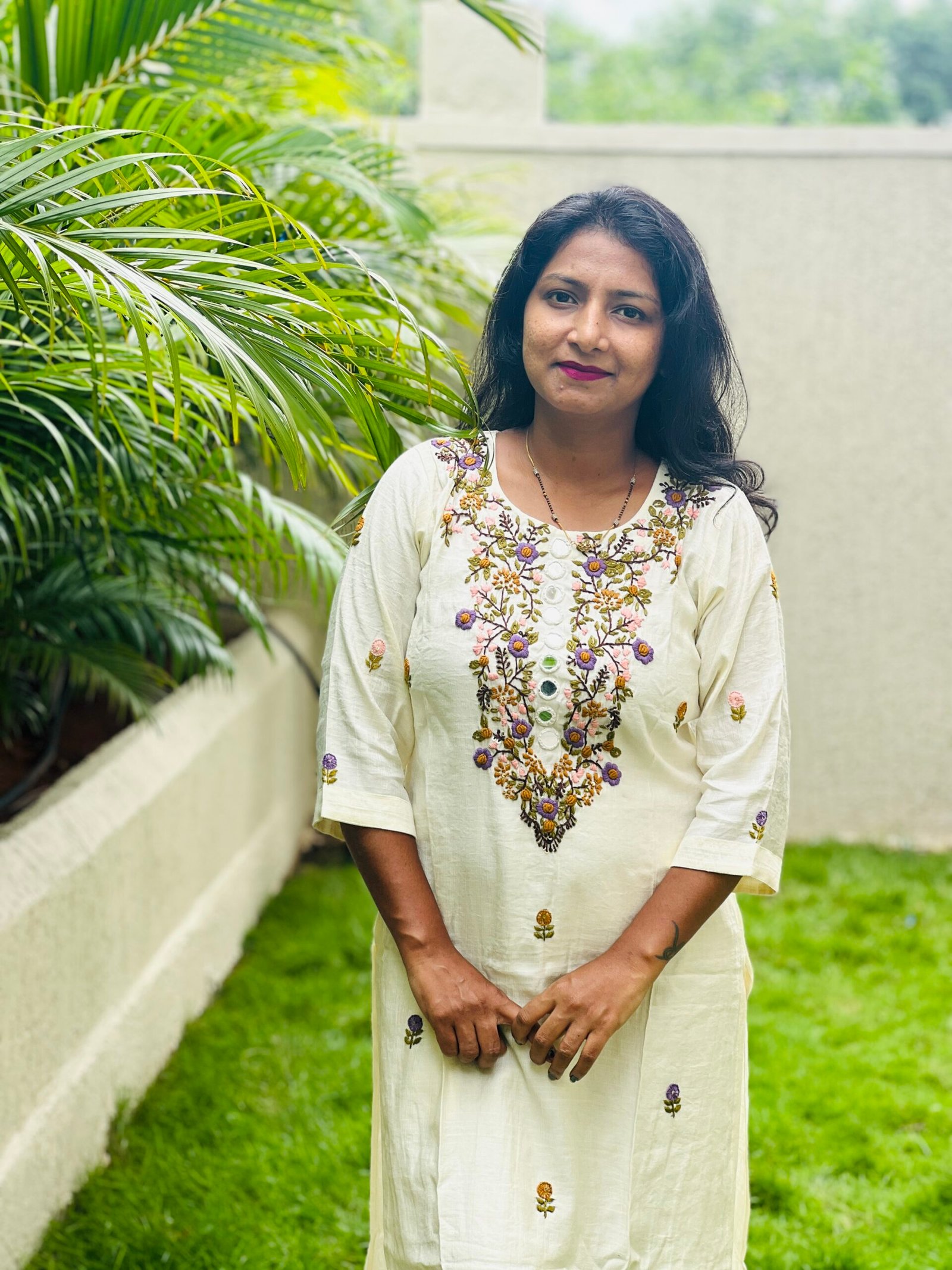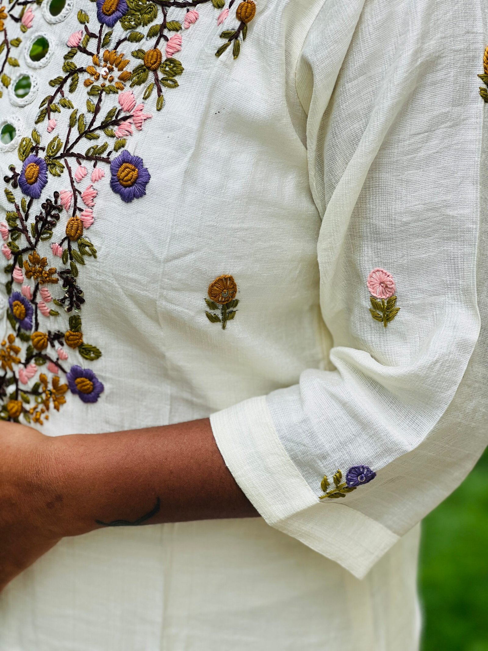 This Co-ord Set with Heavily Embroidered Bullion knot Handwork with Original Mirror Handwork as the off-white color Kurti matched with pastel color Thred Handwork gives you a very aesthetic look.