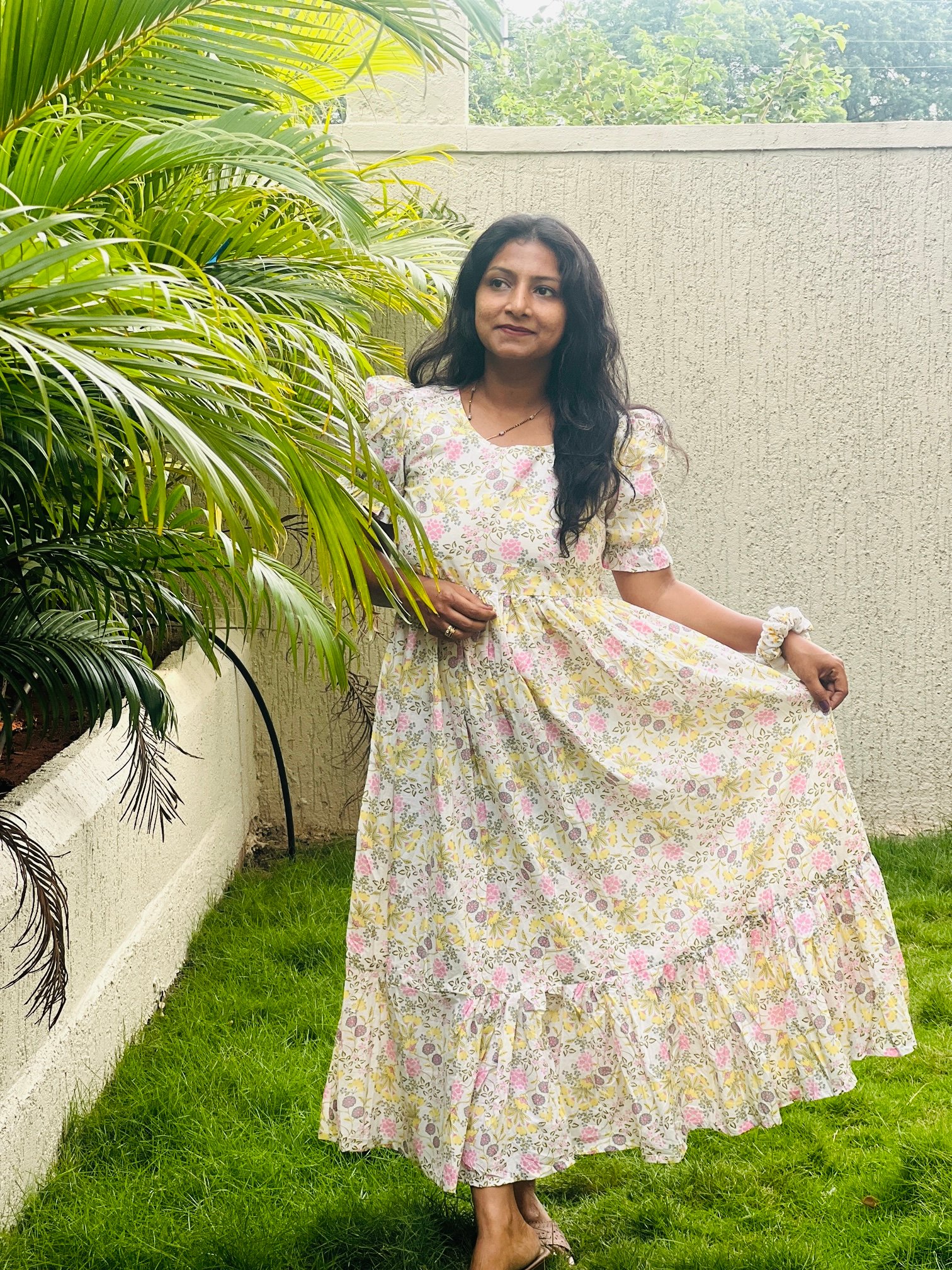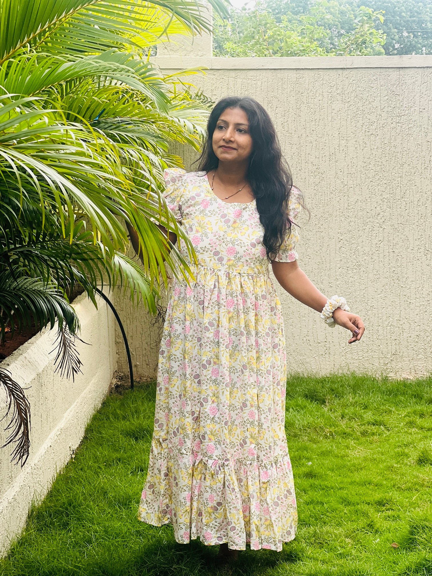 PATTERN– Ankle Length Digital print Pure Cotton frill Dress With Puff Sleeves and with Pure Cotton lining on Yolk Part