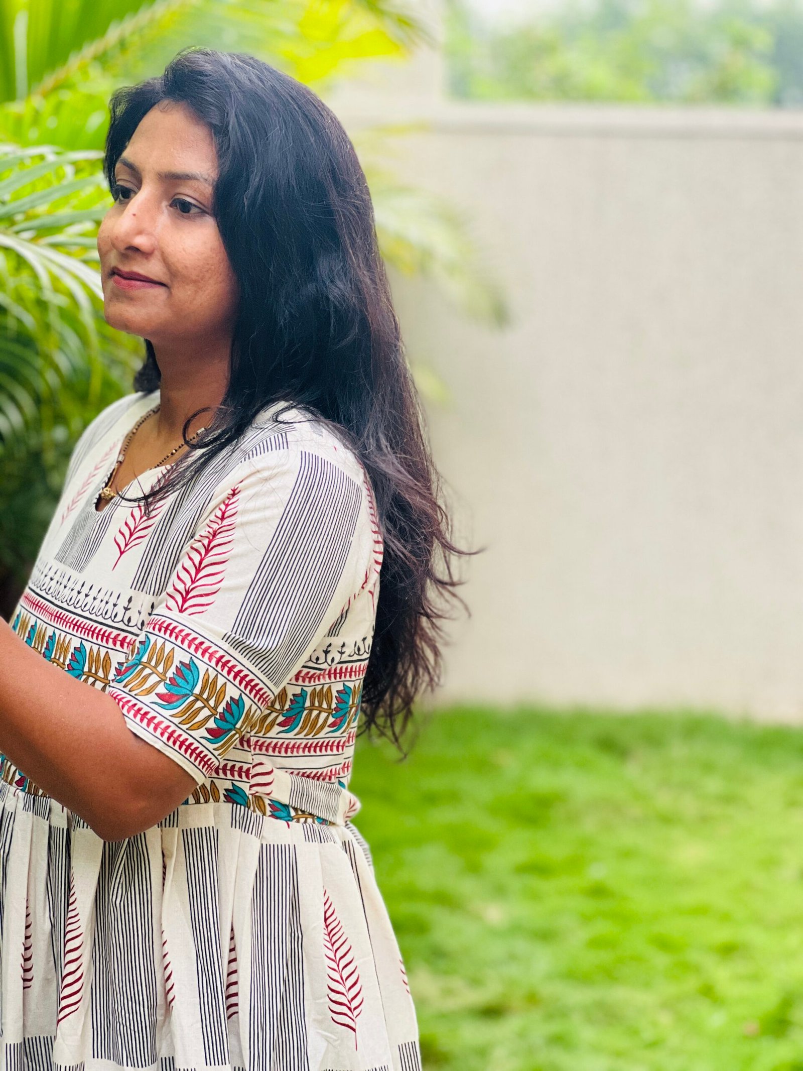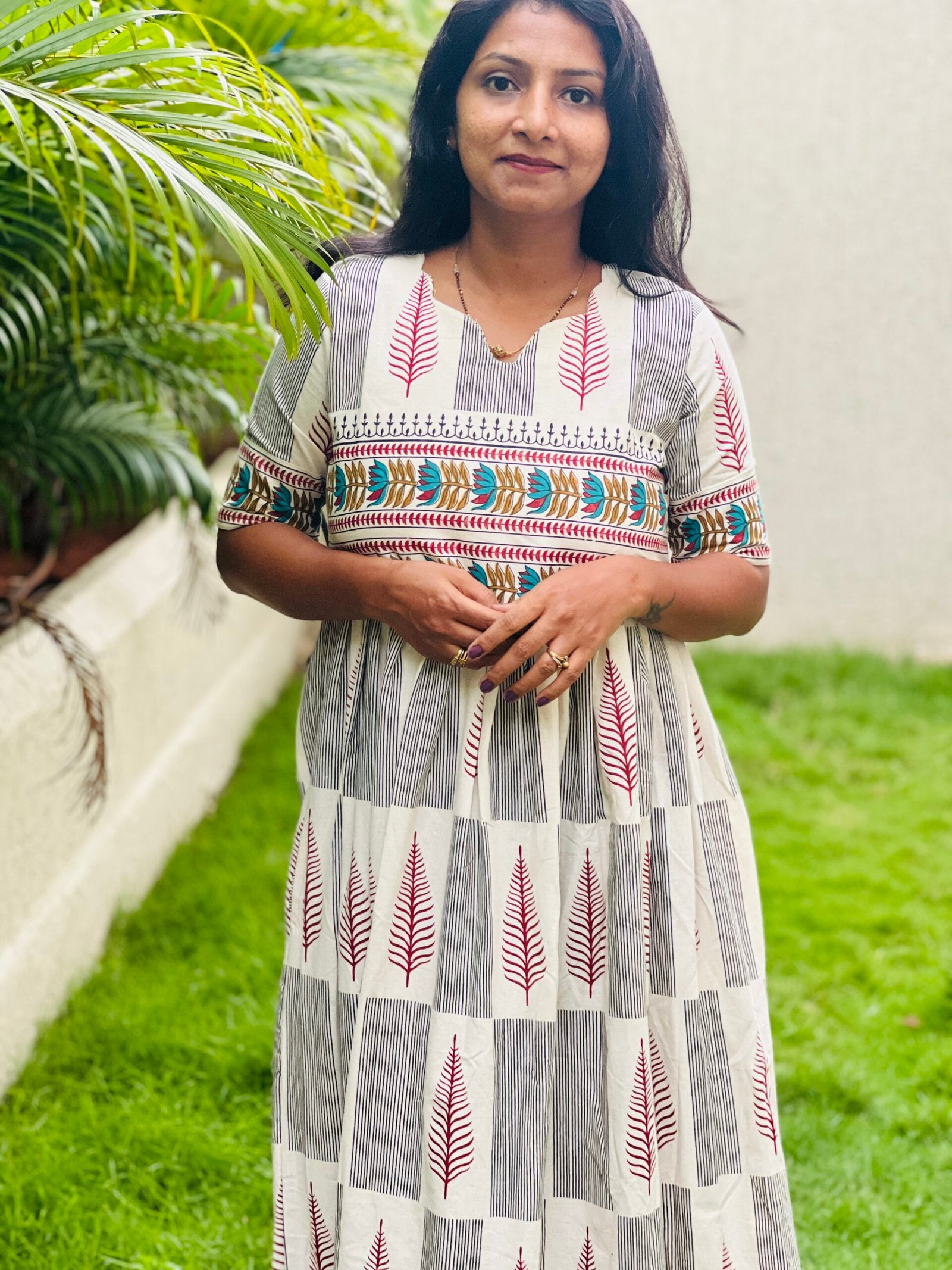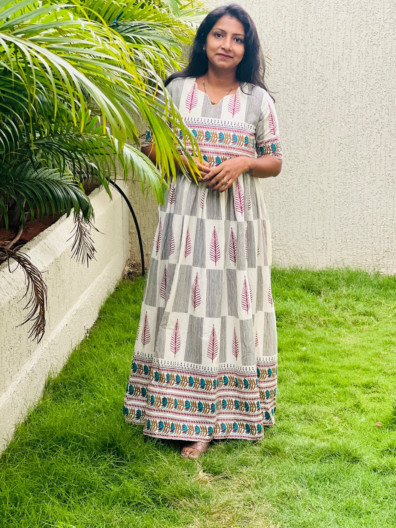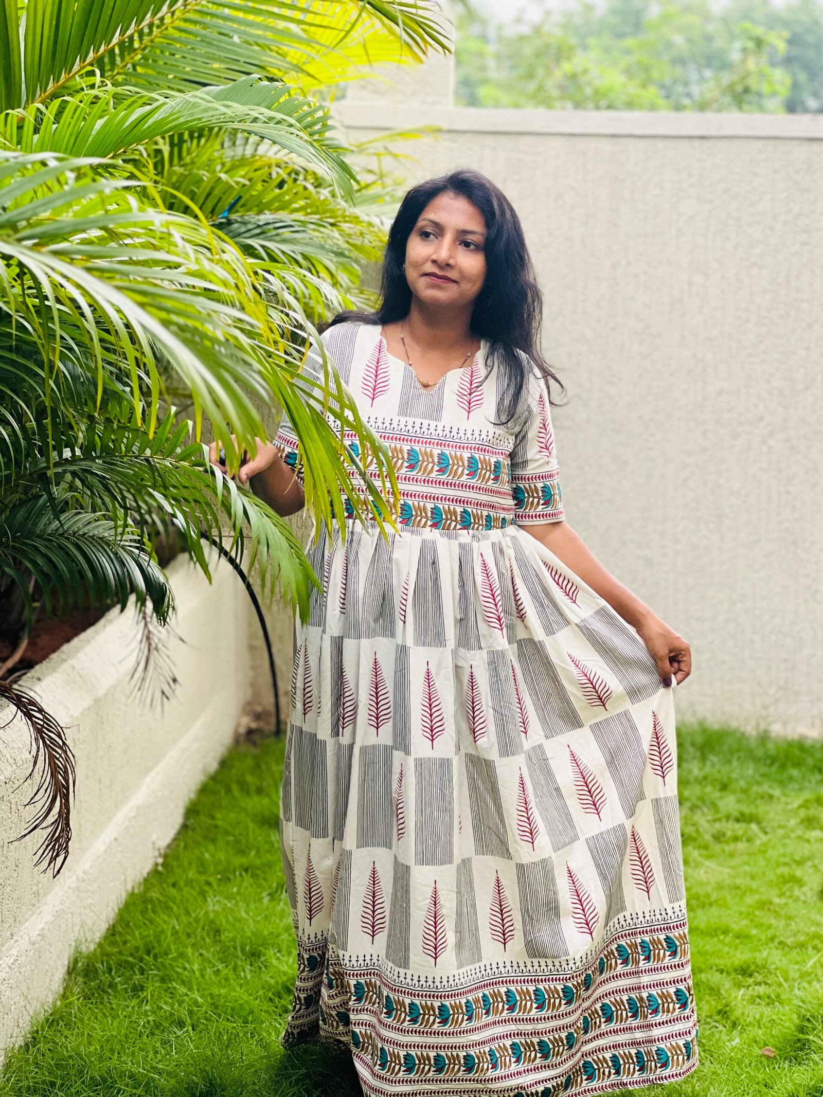PATTERN– Long Dress with Handblock Traditional Print with pure Cotton Lining on Yolk Part