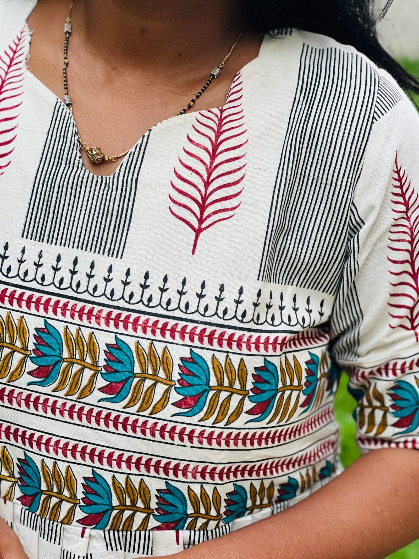 A Dress with a Western look with a Traditional Handblock Print comfort for all day wear with side pocket and lining on the yolk part Best for any outings or Office Wear.