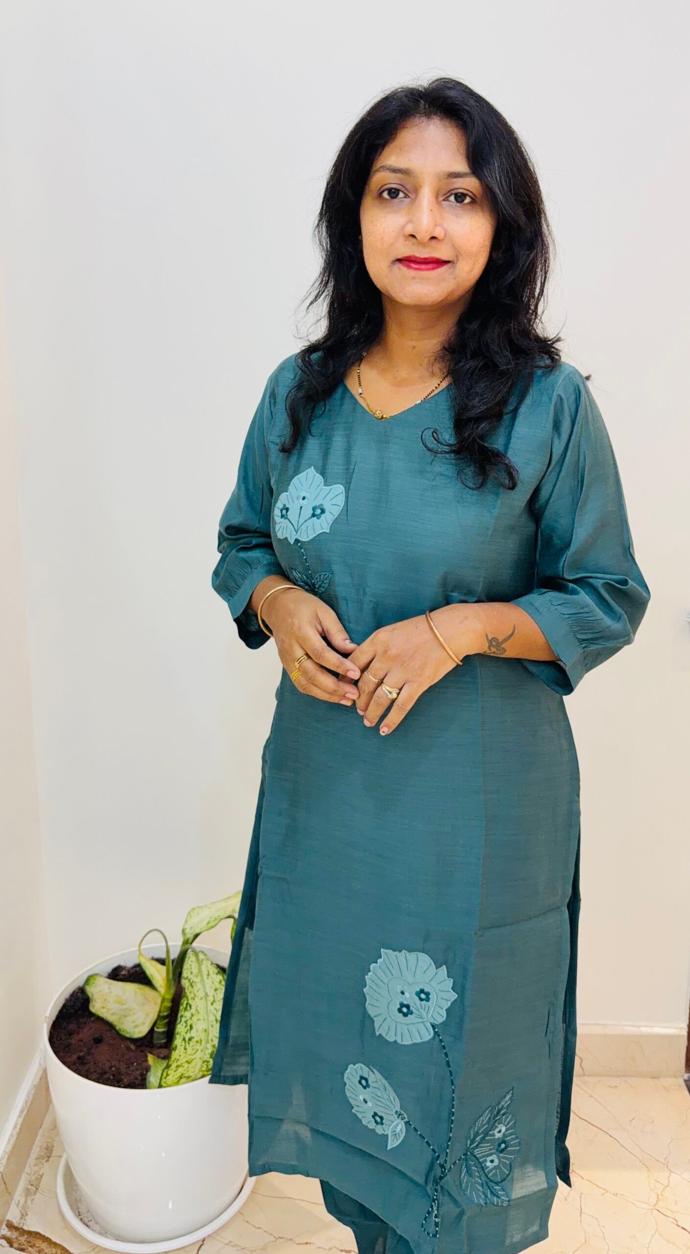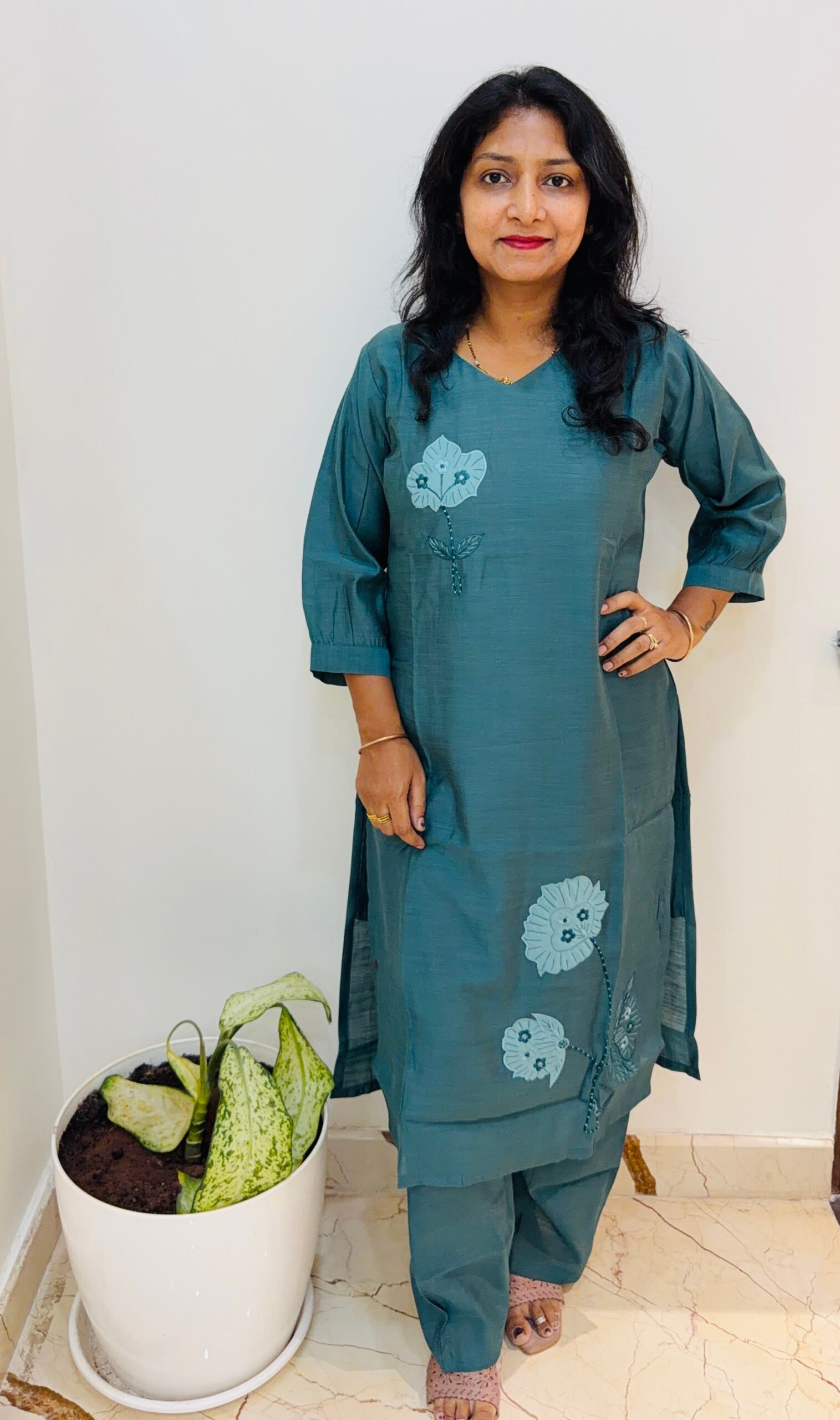 PATTERN – V neck pattern straight cut kutri with Applique work side pocket