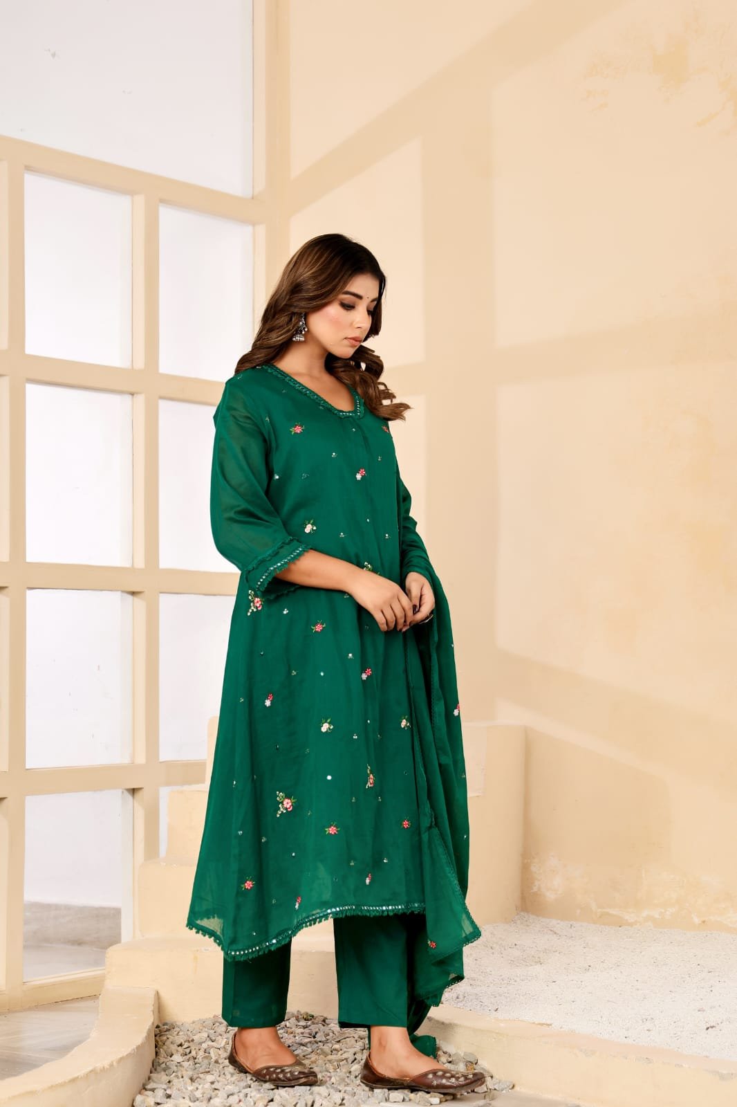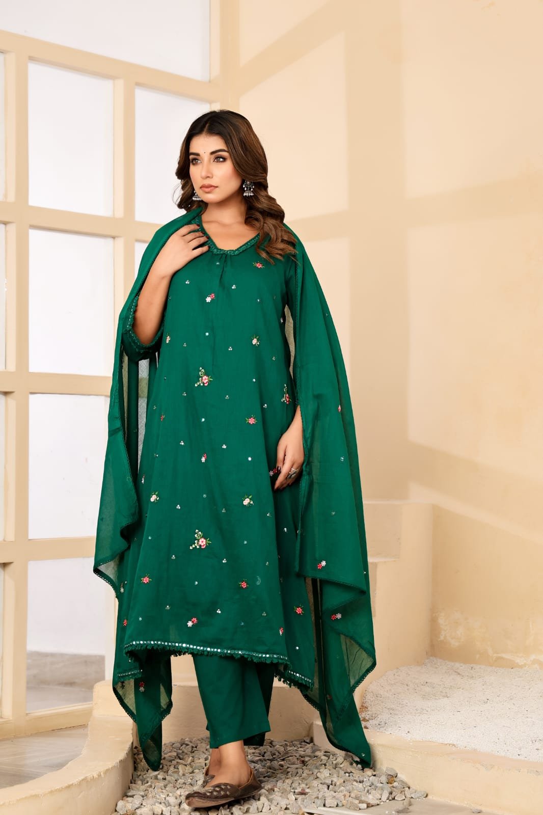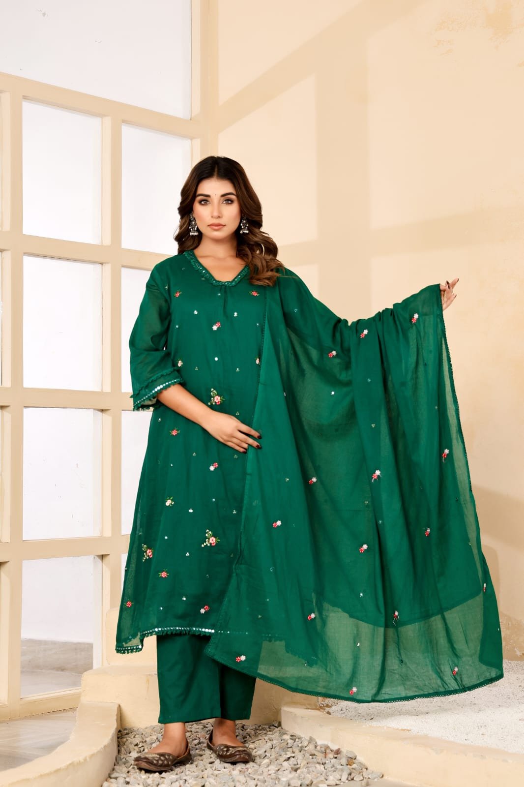 PATTERN – A line pattern with heavy embroidery on neck and all over the kurti with pure mulcotton inner lining with bell sleeves