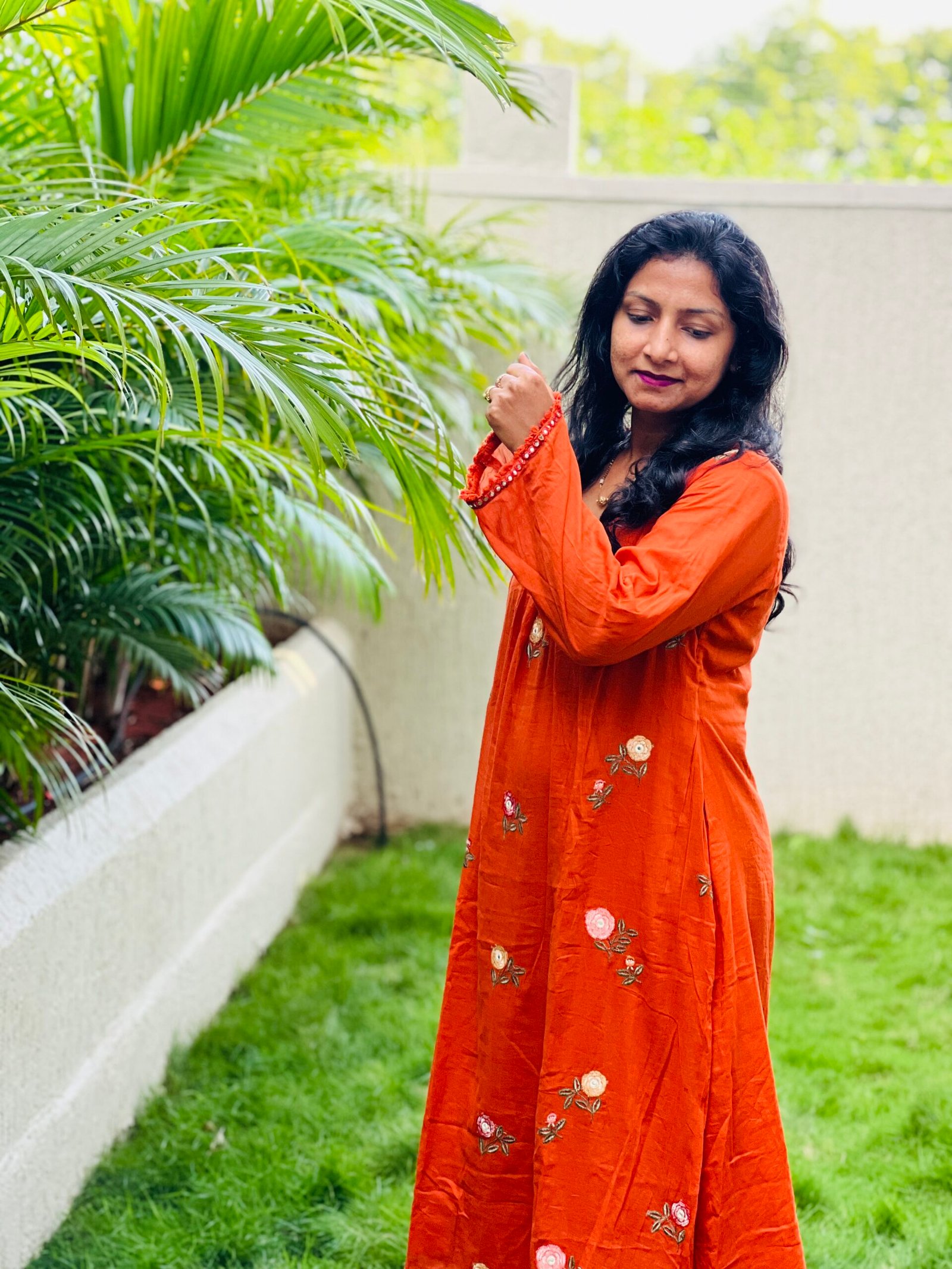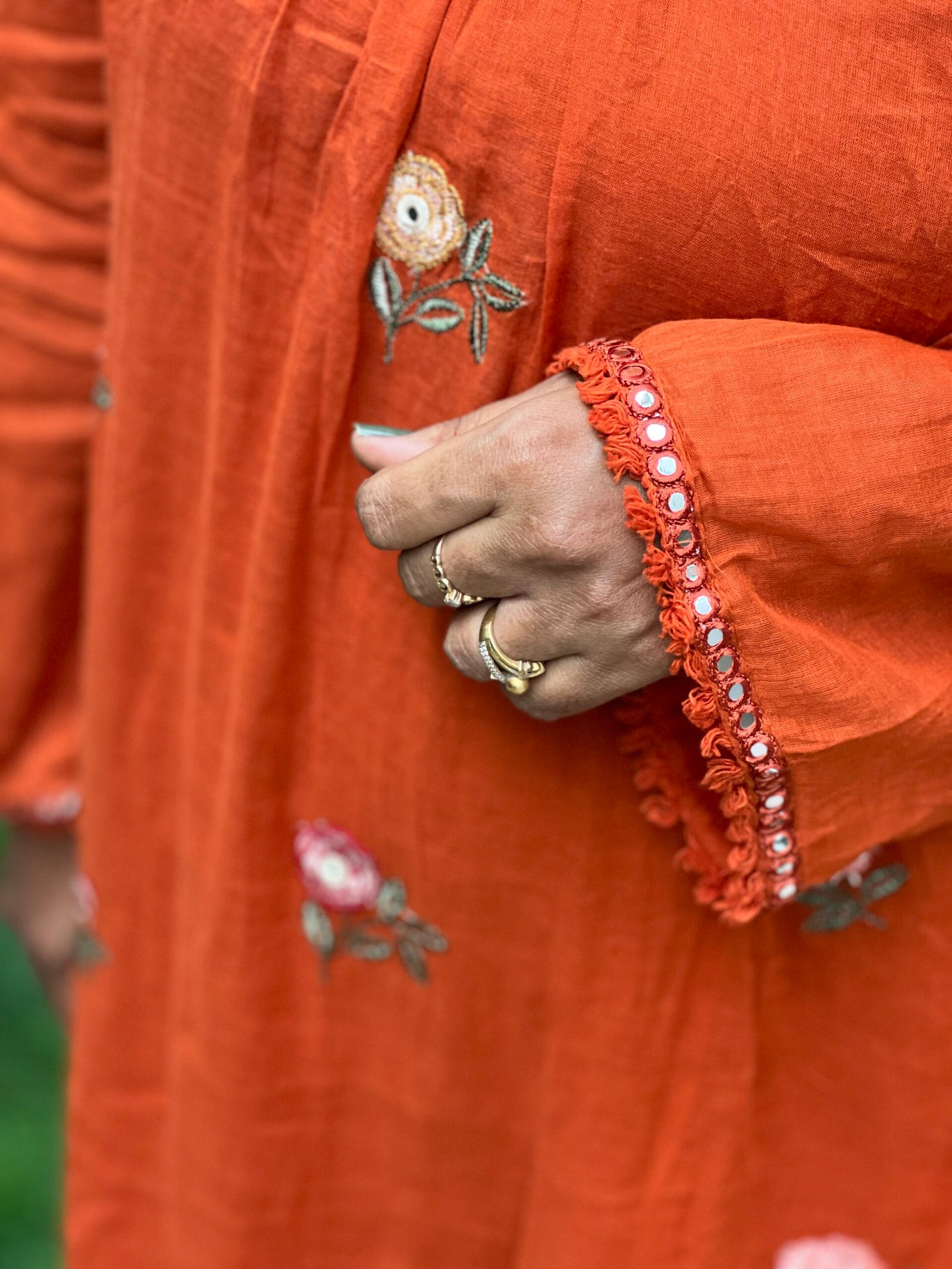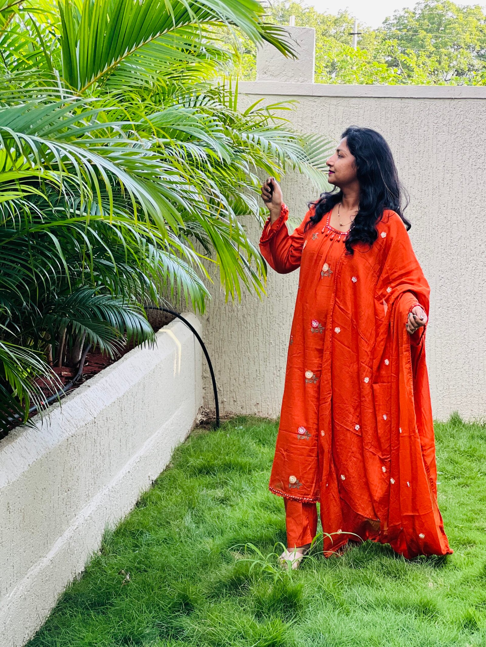Rust Orange Heavy Embroidery Aline Pure Mul Cotton Umbrella Sleeves 3PC Kurti Set