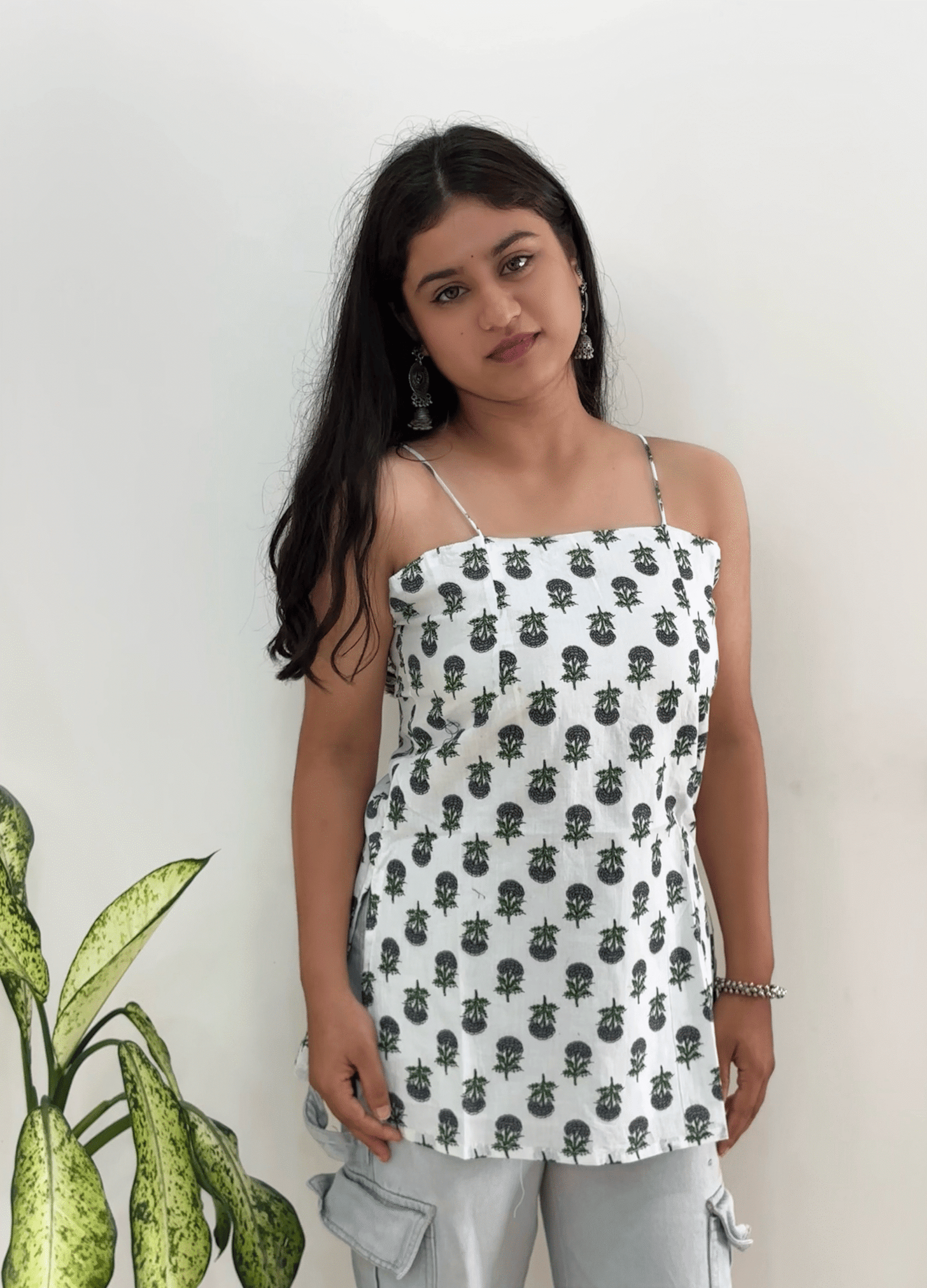 If you want to flaunt your style while keeping that timeless Desi touch, this pure cotton noodle strap top is a must-have in your wardrobe.